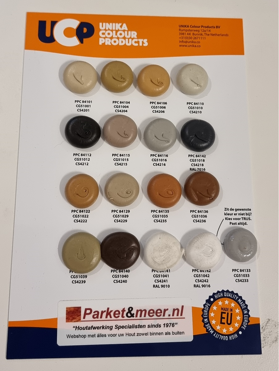Nuancier spécial du kit de mastic coloré avec des échantillons de mastic permettant de déterminer la couleur exacte.